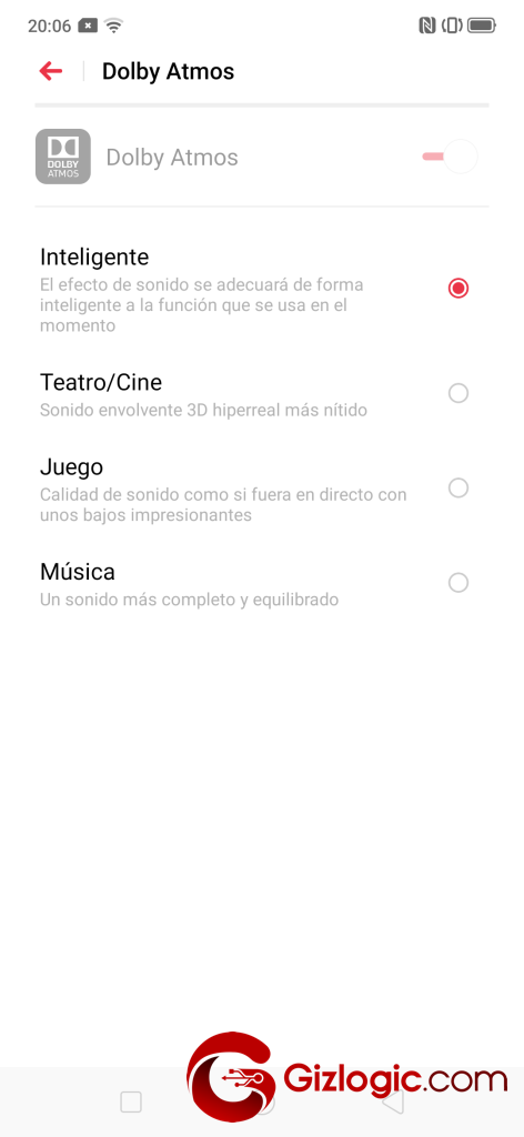 Aunque para sacar el verdadero partido a sus capacidades multimedia será necesario utilizar un adaptador o auriculares USB-C. Solo de esta manera podemos acceder al apartado de configuración Dolby Atmos del que dispone este Oppo, ya que no es compatible con dispositivos Bluetooth. Este sistema de sonido envolvente virtual cuenta con diferentes perfiles para adaptarse a los contenidos que estemos reproduciendo en el teléfono.