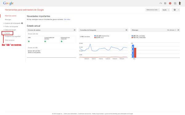 2.1) Entra en las herramientas para webmaster de Google para tu web o Blog y haz "clic" en el menú de la izquierda en "Rastreo". Su aún no has utilizado las herramientas para webmaster de google, realiza esta guía paso a paso para aprender a utilizarlas.