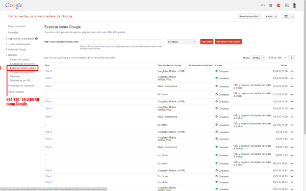 2.2) Haz "clic" en la opción "Explorar como Google" (si es la primera vez que accedes a "Explorar como Google" no te aparecerá una lista de rastreos como la que se muestra en el pantallazo inferior):