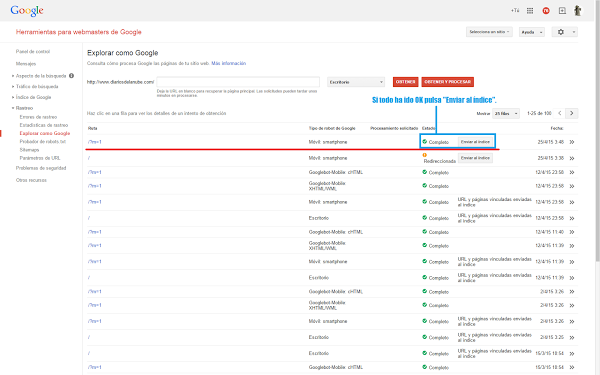 2.5) Si todo ha ido correcto, habrás podido comprobar que aparecerá un icono de verificación verde indicando que el rastreo de tu web con los robots de Google (Googlebot) para móvil: smartphone ha sido correcto. Además aparecerá la palabra "Completo" indicando que el análisis de tu página ha sido correcto. Por último, si todo ha dio bien, pulsa el botón "Enviar al índice" para enviar directamente lo analizado en el rastreo de tu página al índice.