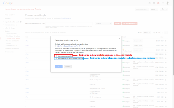 2.6) Al pulsar la opción "Enviar al ínidice" te saldrá una ventana en la que indicar si quieres enviar al índice sólo la dirección que has rastreado o todas las direcciones que haya dentro de la página que has rastreado.Si seleccionas "Rastrear esta URL" rastreará y enviará al índice sólo la dirección que has introducido anteriormente. Si seleccionas "Rastrear esta URL y sus enlaces directos", rastreará y enviará al índice todas las páginas de los enlaces que se contengan en la página que mandaste a rastrear.