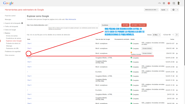 Si te aparece el aviso de "redireccionada" , Googlebot para m´voiles (el robot rastreador de Google para móviles) te está avisando de que has introducido una dirección que contiene una redirección a otra página. En este caso, al tratarse de un Blog en Blogger, el aviso se produce porque Googlebot para móviles ha accedido a la página sin el el parámetro ?m