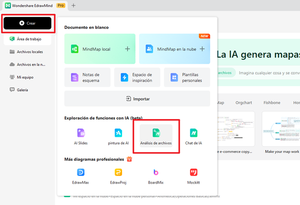2.- Utiliza la IA. Haz clic en "crear análisis de archivo" donde deberás subir el PowerPoint. También puedes ir al menú de IA y presionar en la opción "análisis inteligente".