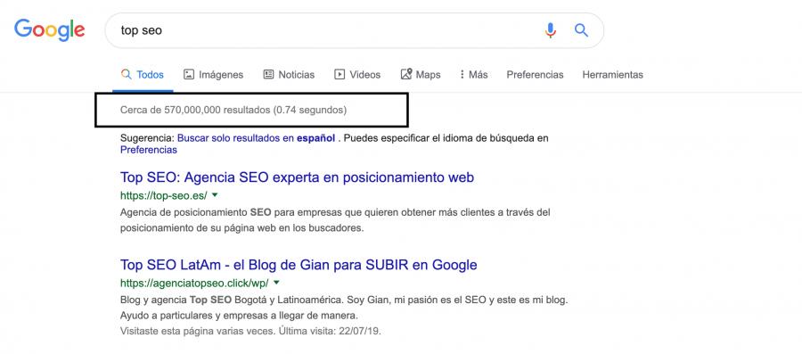 Además, en este artículo, muestro como estaba rankeando en la cuarta posición en los resultados en español por la palabra clave top seo. Hoy, 27 días después estoy rankeando en la segunda posición en los resultados universales (570.000.000 de resultados) en colombia y octavo en españa.