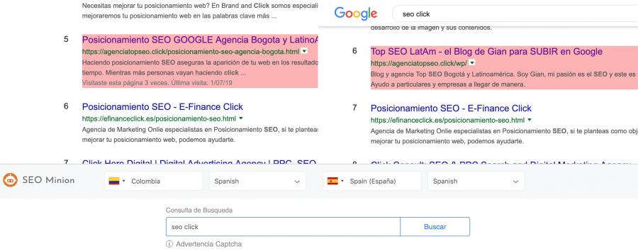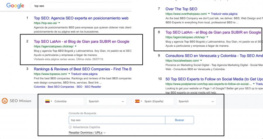 ejemplo ranking top seoEn la columna de la izquierda se muestran los resultados de búsqueda en el índice de Colombia; y en la derecha se muestran los resultados de búsqueda del índice en España. La herramienta que hace esta función se llama SEO Minion, es completamente gratuita y en este artículo puedes ver todos los detalles.