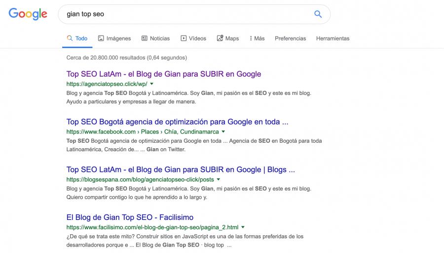 Esto te lo explico mejor con un ejemplo. Cuando las personas empiezan a conocerte, inmediatamente te conectarán con tu marca. En mi caso es Top SEO y en base a esta palabra, que se ha convertido en mi palabra clave principal, he hecho girar toda la estructura de mi posicionamiento; incluyendo mi nombre (Gian). Este también está directamente ligado a la marca.ejemplo de gian