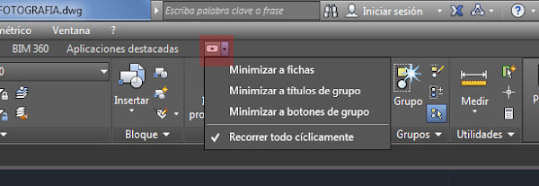 Para poder modificar la cinta pulsaremos sobre el botón que está marcado en la imagen inferior, aparecer tres opciones de cinta; minimizar a fichas, minimizar a títulos de grupo y minimizar a botones de grupo. Vamos a ver más a fondo las tres opciones y después elige la que más te interese.