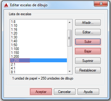 NOTA: Siempre que creemos una nueva escala, en este caso 1:250 en unidades de papel escribiremos el primer número que está separado por los dos puntos, en este caso 1 y en unidades de dibujo escribiremos el segundo número en este caso 250.
