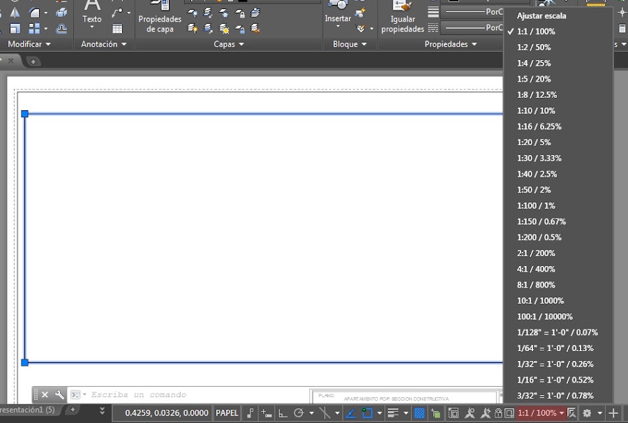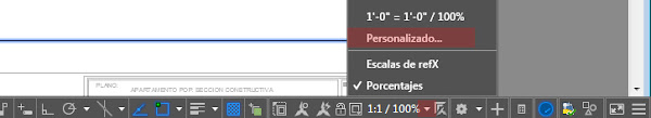 Para empezar pulsaremos y seleccionaremos la ventana gráfica que vamos a escalar, una vez seleccionada en la parte inferior derecha de la pantalla de Autocad 2015 aparecerá el desplegable para asignar la escala a la venta gráfica.