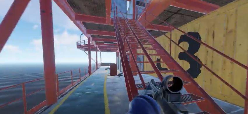 Nada más subir te encontrarás al primer boot, por lo que sitúate detrás de las cajas para evitarle y coger ángulo para dispararle a la cabeza.