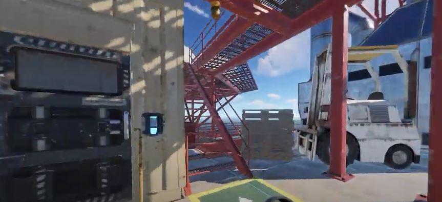 La estrategia va a ser subir a las escaleras que hay en la parte del fondo a la izquierda del tercer piso, donde está esa grúa color rojo y blanco.