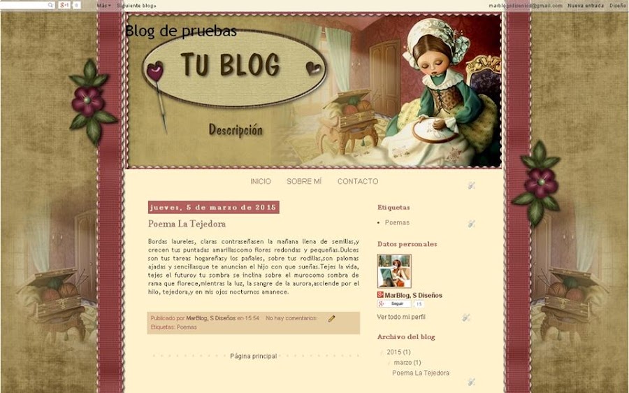 Diseñar plantillas y cabeceras es algo que me encanta. Hoy os voy a mostrar un conjunto de plantilla y cabecera para bloger que diseñé hace un tiempo cuando tenía mi otro blog. Su protagonista es una ilustración de Nina de San, La Tejedora. Ideal para blogs de costura.
