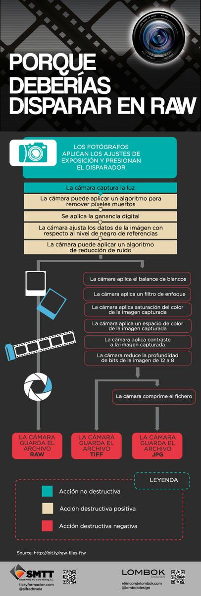 A estas alturas la mayoría de los aficionados a la fotografía que se inician conocen lo que es el formato digital RAW. Pero si en tu caso no tienes claro lo que es, pues echar un vistazo a tipos archivos de imagen. La infografía que muestro a continuación ha sido realizada por infografiasencastellano . Tienes un enlace por si quieres descargarla en formato pdf.