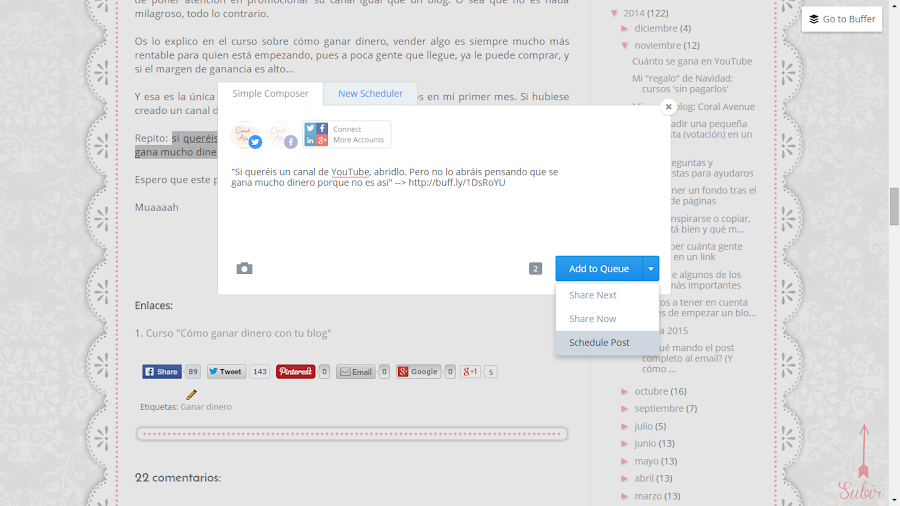 Y luego, imaginaos que estáis en una web o blog y os gusta algo que leéis. Por ejemplo yo estoy leyendo Personalización de Blogs, un post que dice cuanto se gana en youtube (jeje) y veo una frase al final que quiero compartir.