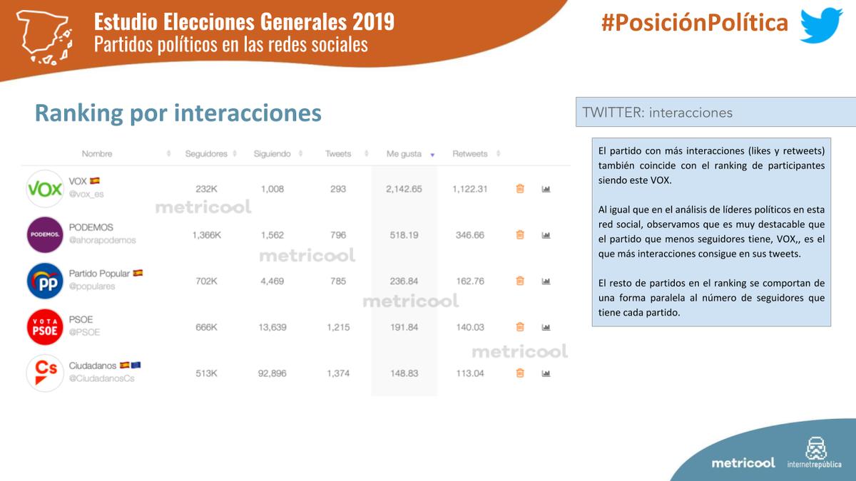 Es también VOX el partido con más interacciones en la red social más política, Twitter. Esto no significa que todas las interacciones sean positivas, puesto que muchos usuarios pueden estar comentando de forma neutra o negativa las interacciones de la formación de Santiago Abascal.