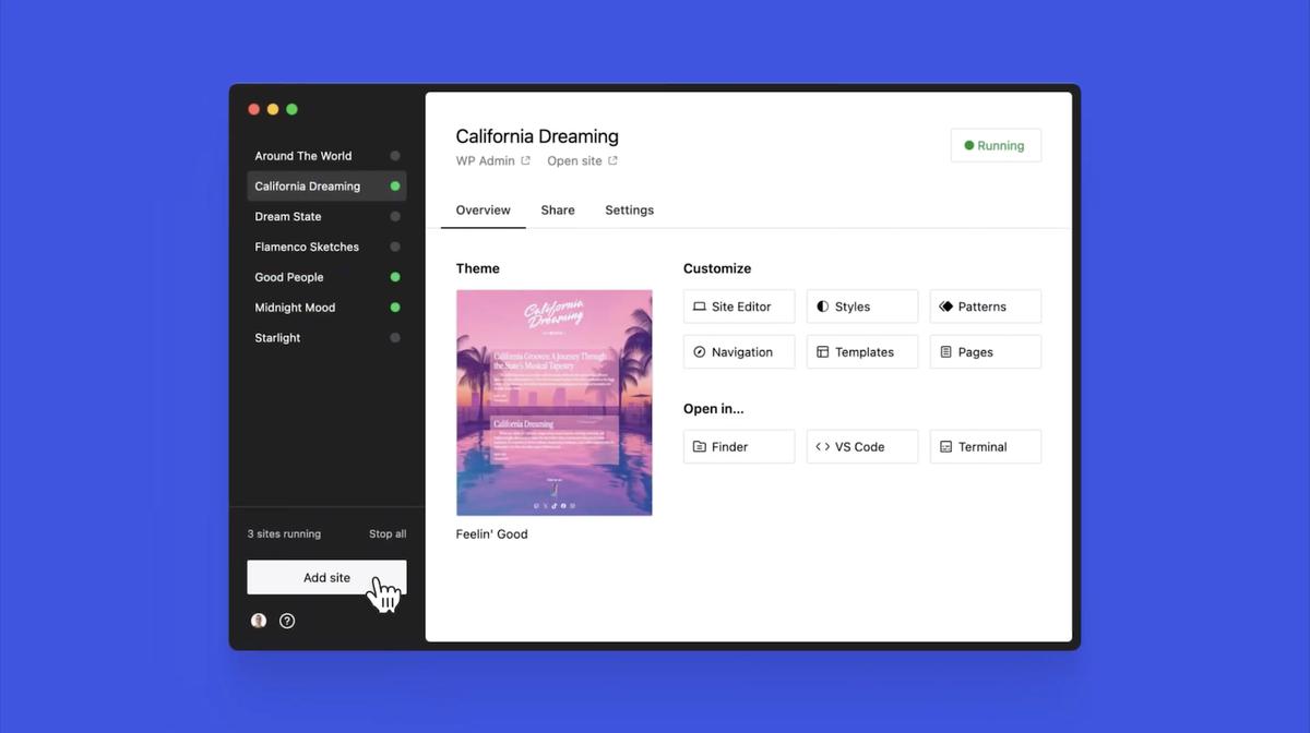 Además, puedes abrir tus sitios locales en tus herramientas de desarrollo preferidas como VS Code, PhpStorm, Terminal y Finder, lo que simplifica aún más la integración de Studio en tu flujo de trabajo de desarrollo actual.