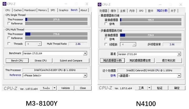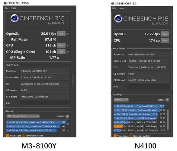 En el primer test de rendimiento realizado con el software de CPU-Z, la versión con el N4100 ha obtenido una puntuación de 186.9 (single-core) y 739.9 (multi-core). Mientras tanto, la versión con el 8100Y ha logrado una puntuación superior de 271.5 en núcleo único y 776.6 en el test multinúcleo.Cinebench R15