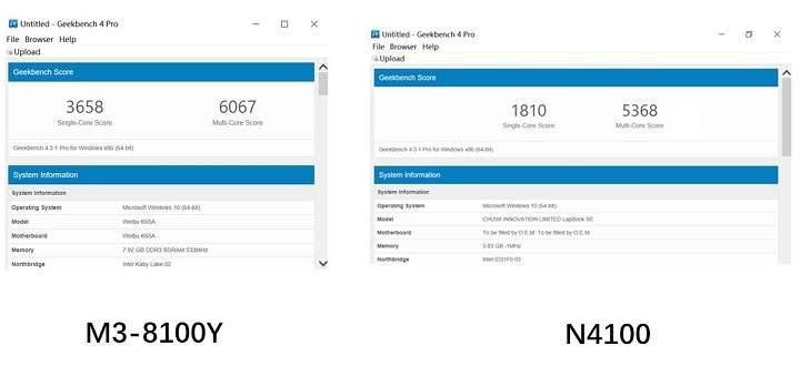 En las pruebas realizadas con Geekbench 4, la puntuación single-core del 8100Y es de 3.658, siendo un resultado que duplica el de la versión N4100. La valoración multinúcleo de las 2 versiones es de 6.067 y 5.368 puntos, respectivamente.Velocidad de lectura/escritura en disco