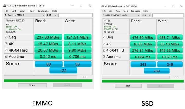 Dado que la versión estándar del MiniBook viene qeuipada por una unidad EMMC de 128 con la posibilidad de añadir un disco SSD M.2, también se han realizado pruebas de velocidad en ambas unidades de almacenamiento.