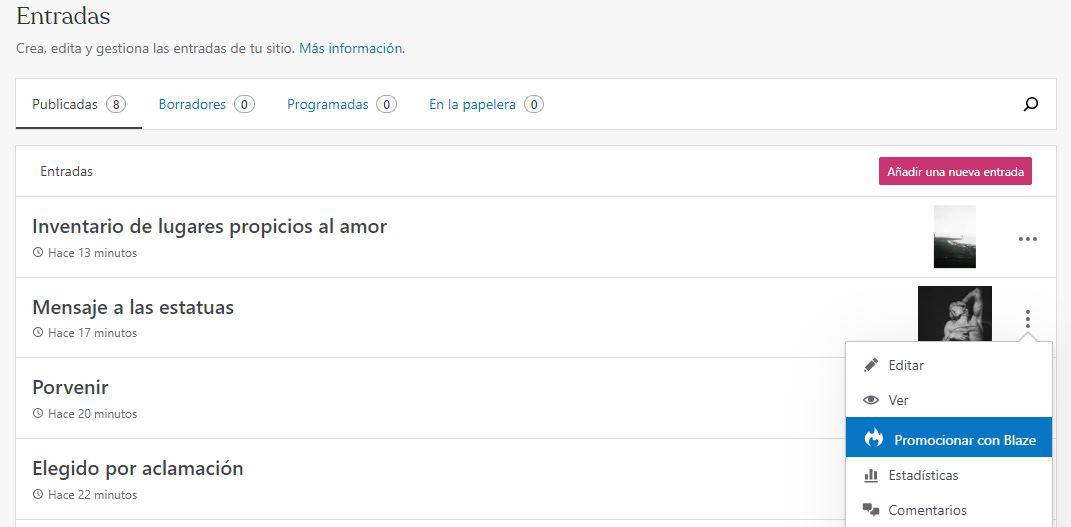 Si tu sitio web está alojado en WordPress.com, ve a Herramientas > Publicidad desde el escritorio; allí verás una lista de publicaciones y páginas recientes que puedes promocionar. Si tu sitio WordPress no está alojado en WordPress.com, puedes aprovechar las ventajas de Blaze a través del plugin Jetpack.Otra forma de acceder es a través del listado de publicaciones o páginas que verás en Mi sitio. Cuando hayas decidido qué entrada o página quieres promocionar, solo tienes que hacer clic en los tres puntos de la derecha y hacer clic en la opción Promocionar con Blaze que verás en el menú.