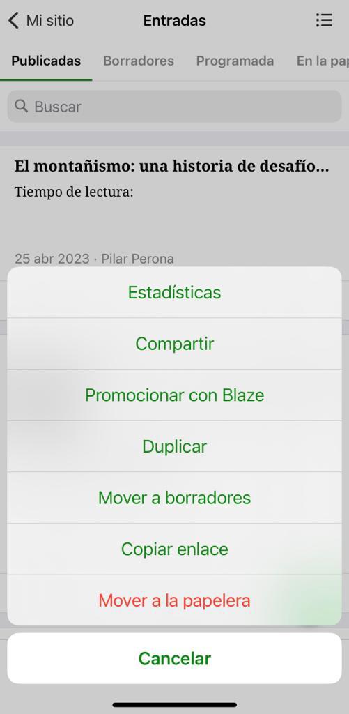 También puedes utilizar Blaze desde donde quieras con la aplicación de Jetpack.Desde el escritorio principal, solo tienes que hacer clic en el mensaje que dice Promociona tu contenido con Blaze. También puedes publicitar tu trabajo directamente en los menús de las páginas y entradas haciendo clic en Más o en el menú de los tres puntos y seleccionando Promocionar con Blaze.