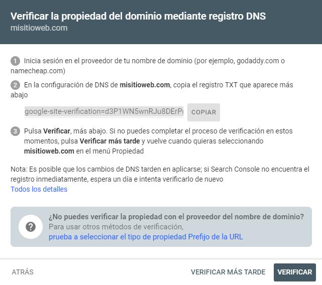 Para obtener esta vista deberás ir a “Añadir nueva propiedad” y en el bloque que indica “Dominio”, deberás incluir tu dominio y verificarlo mediante registro de DNS.