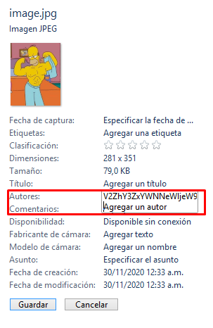 Nos dirigimos a nuestro panel de navegación, observaremos los metadatos que contiene nuestra imagen está el texto en base64