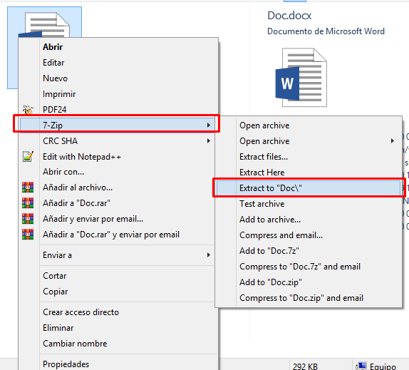 Otra manera darle clic derecho la opción 7-Zip Extracto To “Doc”