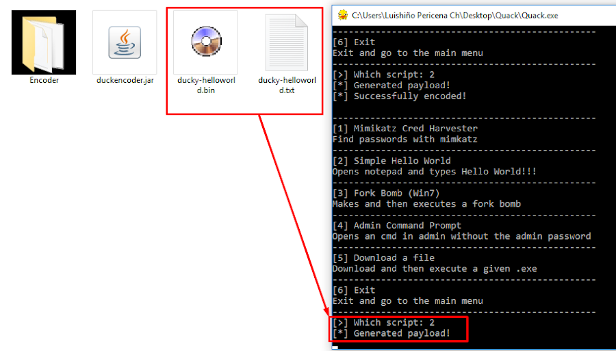 Encoder que nos permite generar el payload en formato .bin para ser ejecutado en la memoria usb aka Ducky.