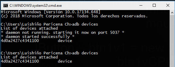 Con este comando obtenemos una lista de todos los dispositivos conectados al ordenador. Esto es muy útil para saber que nuestro dispositivo ha sido reconocido por el ordenador y en el caso de que conectemos más de un dispositivo a la vez.