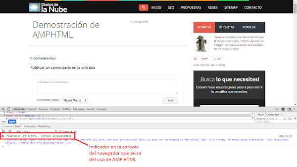 Al presionar F12 en cualquier navegador que utilices, verás que en la consola te comienza a avisar del uso de AMPHTML.
