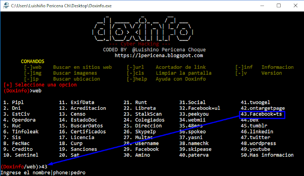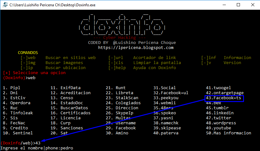 -Ingresamos el comando web y el numero 43 para hacer la búsqueda de nuestra victima ingresamos el email,nombre o numero de teléfono esta búsqueda se realizara en facebook.