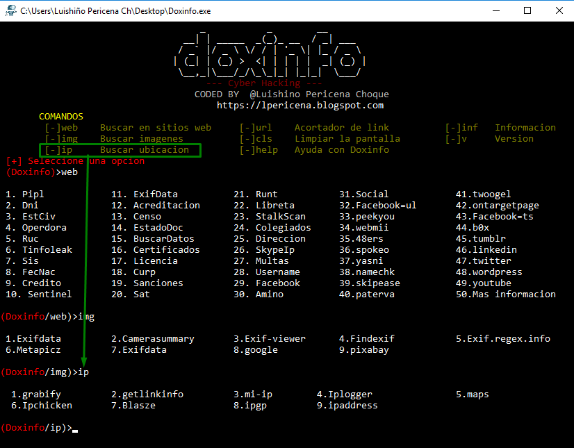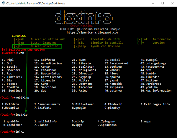 Doxinfo tiene una variedad de opciones de buscadores web para obtener datos de nuestra victimas.