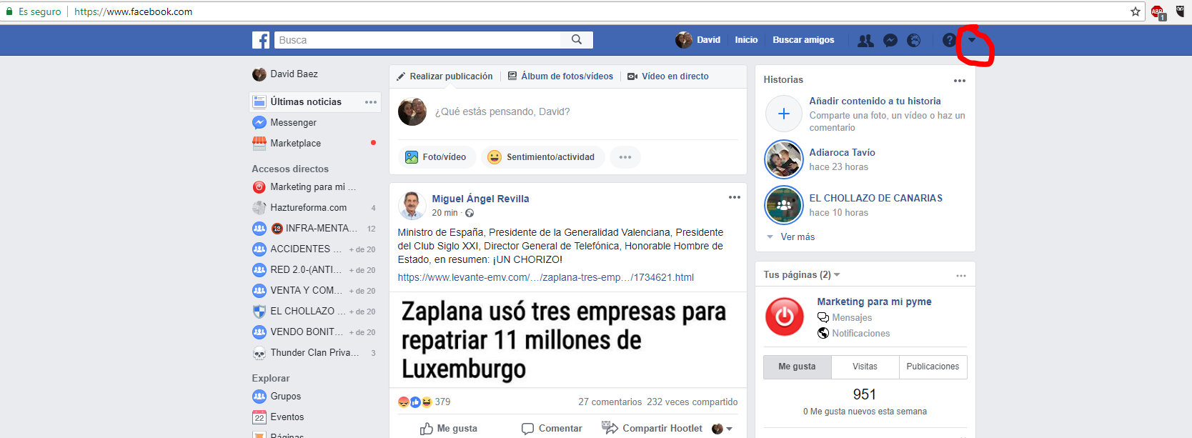 Una vez dentro de nuestra cuenta de Facebook, hacemos clic en el desplegable de la imagen.
