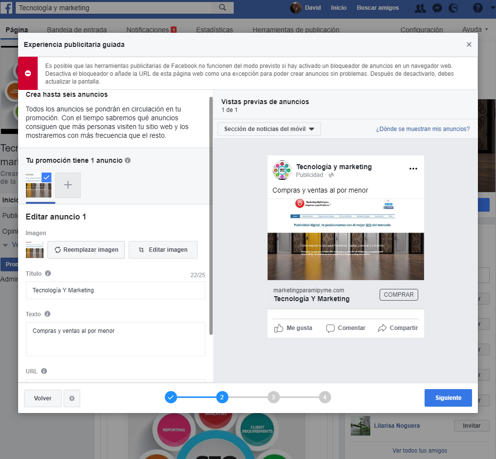 Seguidamente veremos una ventana de configuración del anuncio en si. En la misma promoción puedes editar varios anuncios.