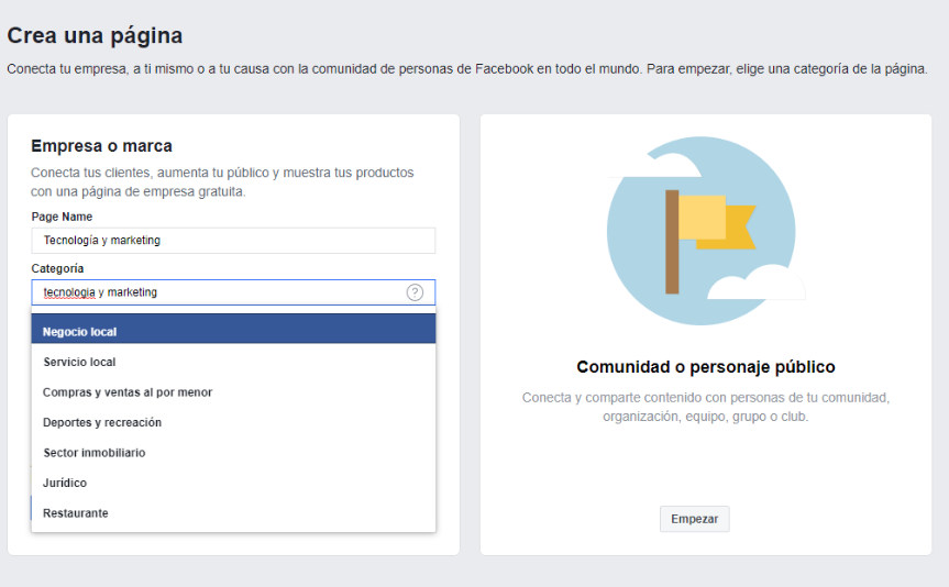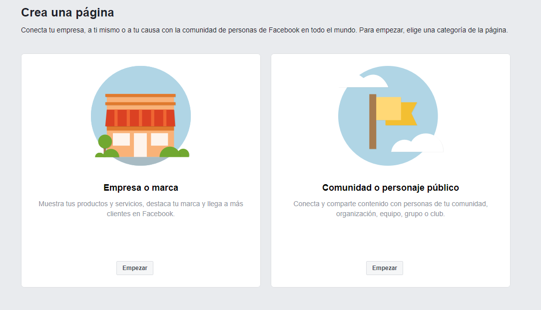 Si lo que queremos es gestionar una grupo, comunidad o personaje publico, elegiremos el de la derecha. Si por el contrario queremos dar a conocer nuestra empresa o marca, le damos a empezar en el marco de la izquierda.