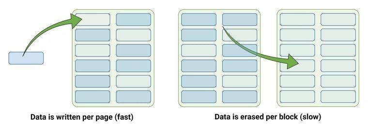 Otra peculiaridad de la memoria flash NAND es que las celdas de memoria no pueden programarse con nuevos datos hasta que todas las celdas hayan sido borradas; en otras palabras, las SSD nunca escriben directamente nuevos datos sobre los antiguos, como hacen los discos duros tradicionales.