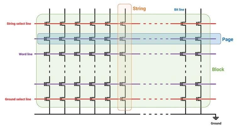 Las celdas de una cadena comparten una traza común (una línea de bits), que se utiliza para leer los datos almacenados en ellas. Las que están en la misma fila -lo que se conoce como página- están conectadas a otra traza común -línea de palabra-.