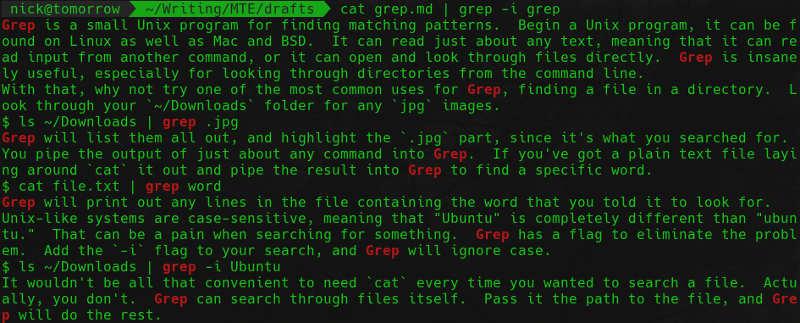 Se canaliza la salida (con el comando «||») de casi cualquier comando a grep. Si tiene un archivo de texto plano por ahí, sáquelo y coloque el resultado en Grep para encontrar una palabra específica.