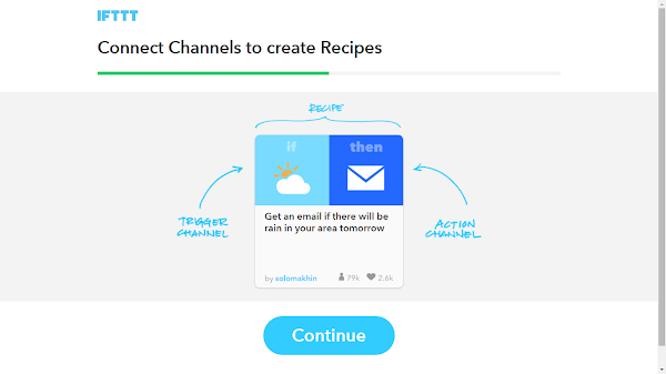 Una vez de que le hemos dado ahí, deberemos elegir un desencadenante para nuestra receta y una acción final, enlazándolas a nuestros respectivas cuentas cuando sea necesario.