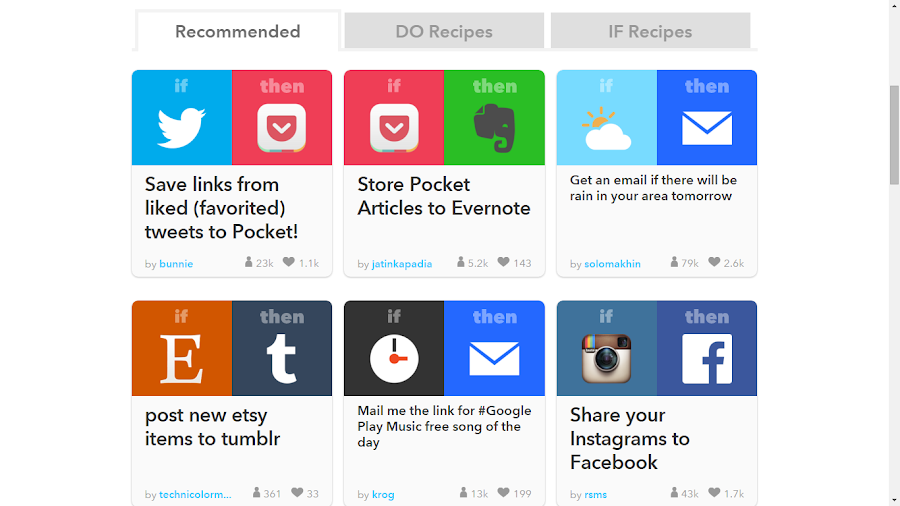 Una vez elegidas, estaremos por fin en la página de recetas (ifttt.com/recipes), donde en la parte de abajo (arriba tenemos un menú y luego un slide con links a diferentes tipos de recetas) nos mostrará algunas ideas de recetas