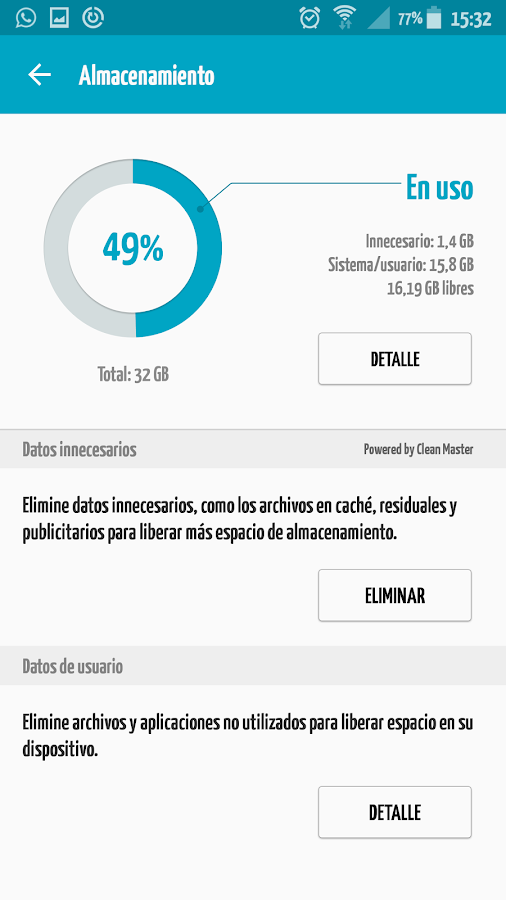 En esta opción tenemos varias cositas muy interesantes, como por ejemplo pinchar en Detalle y ver como tenemos repartida la memoria, tanto la que tengamos en el propio dispositivo como si a su vez disponemos de tarjeta microSD. Tambien los datos almacenados de cache.