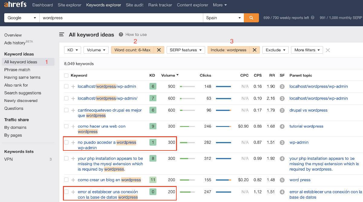 Con Ahrefs tenemos la opción de usar el keyword explorer junto a diferentes filtros para encontrar palabras clave long tails.