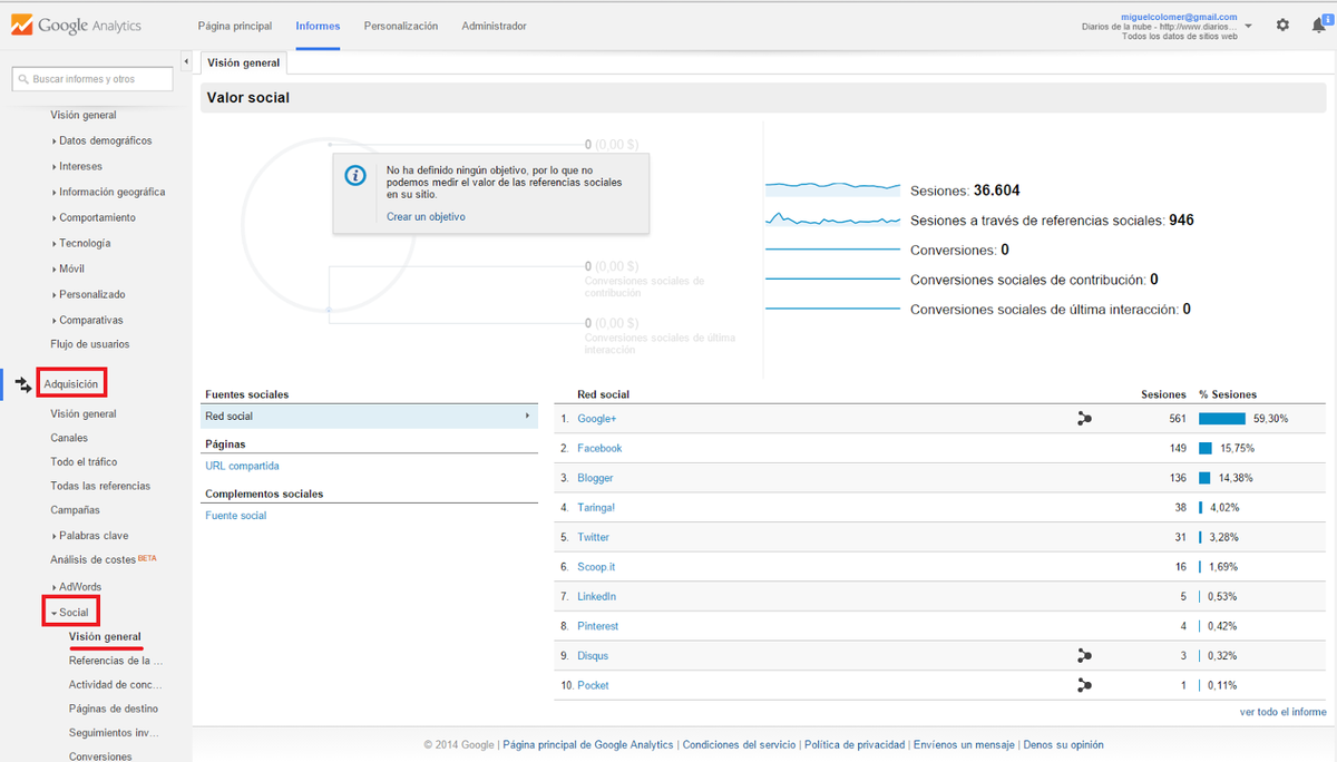 3) A continuación haz clic en el menú de la izquierda de google Analytics en "Adquisición", después en "Social" y dentro de social ve a "Visión general".