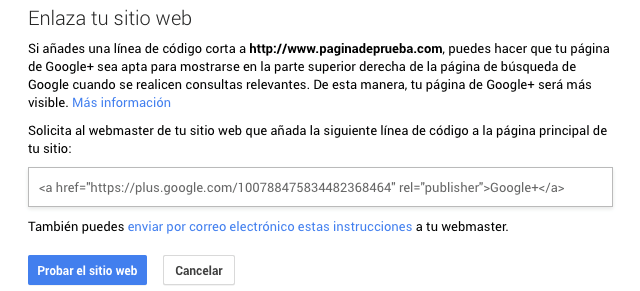 Tendrás la posibilidad de enlazar tu página en Google Plus con tu sitio web. Para ello, le tendrás que enviar a tu programador web el código que te aparezca: