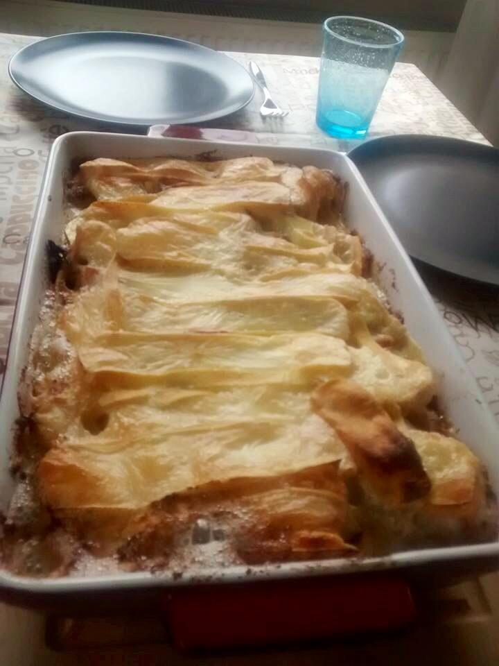 Ahora vamos a montar la tarfiflette, en una fuente para horno, coloca una capa de patata, salpimenta ligeramente y extiende la mitad de la cebolla y bacon. Encima, colocaremos otra capa de patata, dejando huecos entre ellas para que luego pueda caer la nata y el queso. Extendemos la otra mitad de cebolla y bacon y terminamos con otra capa de patata.