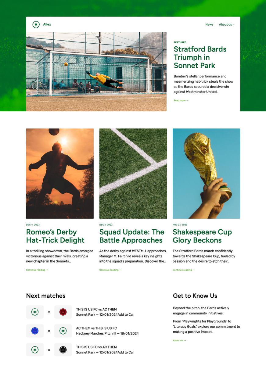 Los deportes siempre levantan pasiones, tanto para los aficionados más entusiastas como para los espectadores ocasionales. Allez es el tema ideal para documentar esa parte de ti. Diseñado especialmente para deportes, el diseño, los estilos y los patrones que utiliza resuenan con este mundillo. Pero como siempre, WordPress es tan versátil que si te gusta el diseño general de Allez, lo puedes personalizar fácilmente para que se adapte a cualquier proyecto.