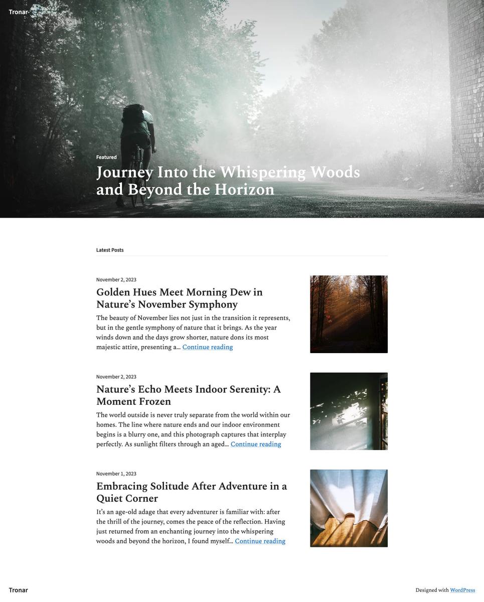 Construido a partir de uno de nuestros temas clásicos para blogs (Resonar), Tronar ofrece un diseño elegante para blogueros que quieran combinar un poco de la nostalgia del internet de antes con la simplicidad moderna. Incluye una imagen o entrada destacada inmersiva y de gran tamaño en la parte superior y un listado de entradas debajo: este tema le da todo el protagonismo a tu contenido.