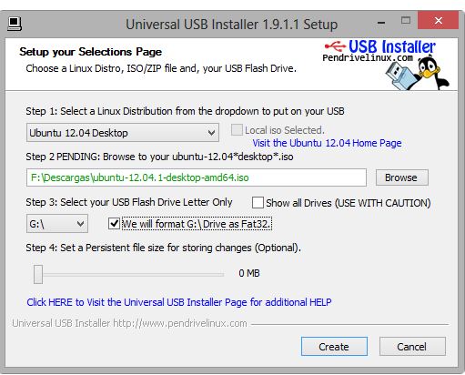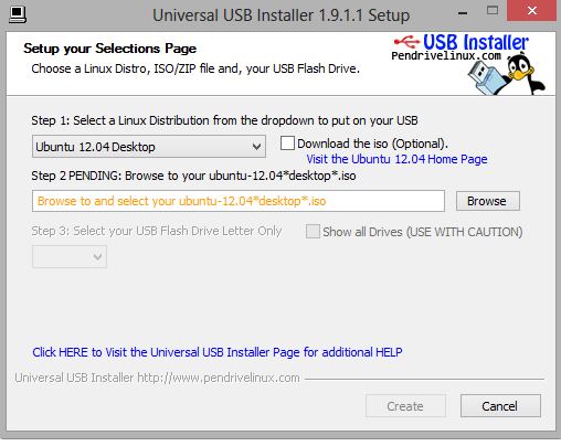 Al abrirlo aparecerá un cuadro más o menos como éste. En Step 1 marcamos el sistema operativo que queremos instalar en la USB, en este caso Ubunto. En Step 2 pinchamos en browse para buscar el archivo del instalador que descargamos primero. Y en Step 3 ponemos la unidad donde tengamos la USB.