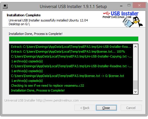 Se pincha en Create y esperamos que se instale. Saldrá esta imagen con lineas de texto que marca que el programa se está instalando correctamente. Cuando finalice pinchamos en close y ya tenemos la USB preparada.